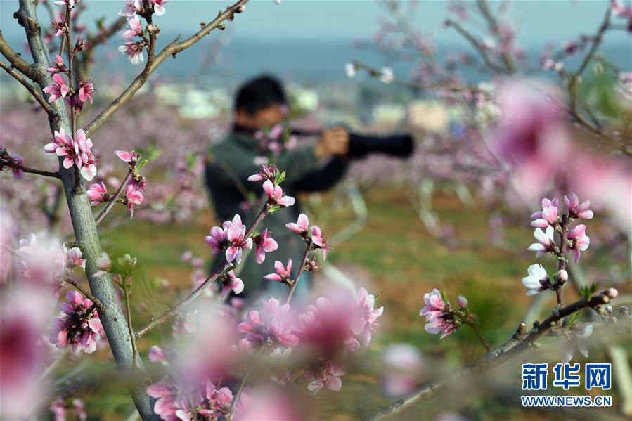 3月22日,游客在云南省曲靖市沾益区盘江镇河西村的果园里拍摄桃花。春季里,云南省曲靖市沾益区乡村果园里的桃花梨花竞相绽放,景色秀美,吸引游人前来观光。新华社记者杨宗友摄