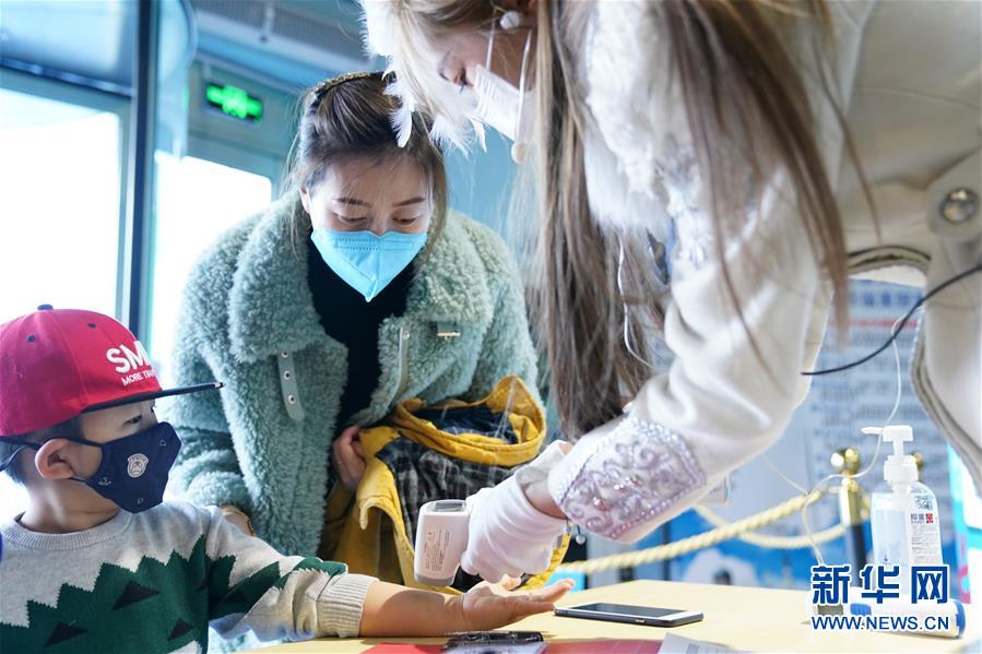 3月23日,在哈尔滨极地馆入口,工作人员在给游客测量体温。当日,哈尔滨极地馆恢复营业。目前,极地馆日接待人数不超过400人,园区采取分时段、间隔性办法安排游客有序入园。游客实名预订门票,入园要配合测温、佩戴口罩、扫描“龙江健康码”,刷身份证入馆。新华社记者王建威摄