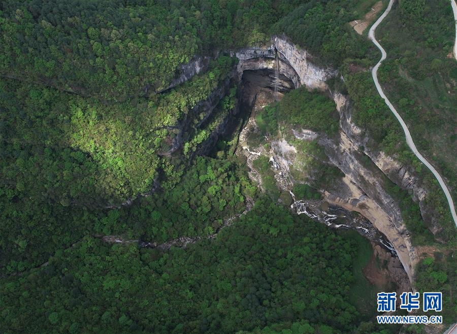 4月22日无人机拍摄的地洞河天坑。新华社记者张博文摄