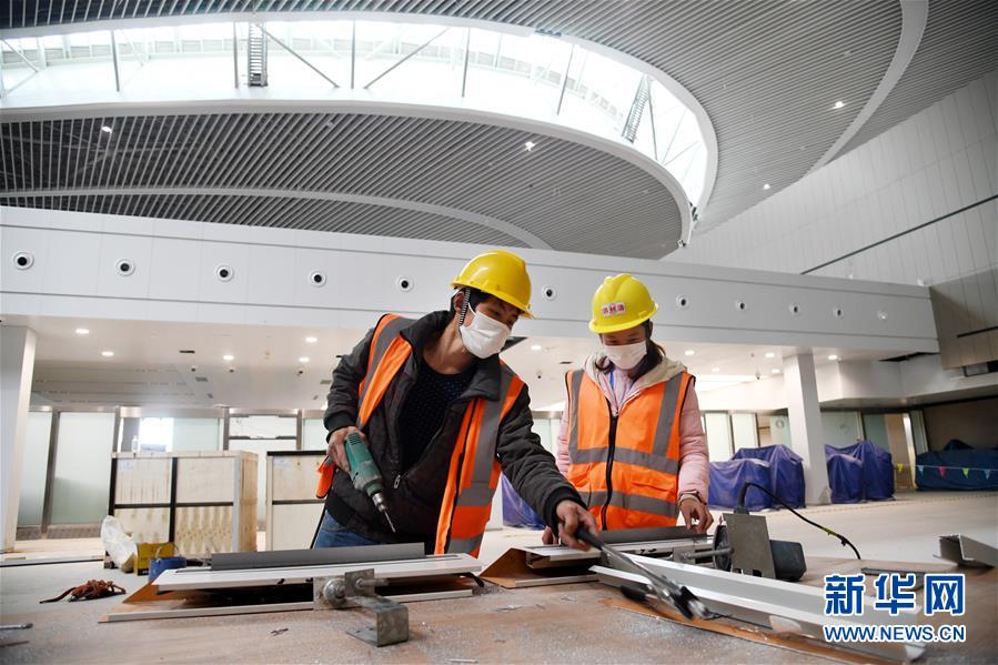3月25日,两名工人在青岛胶东国际机场航站楼中央景观区施工。新华社记者李紫恒摄