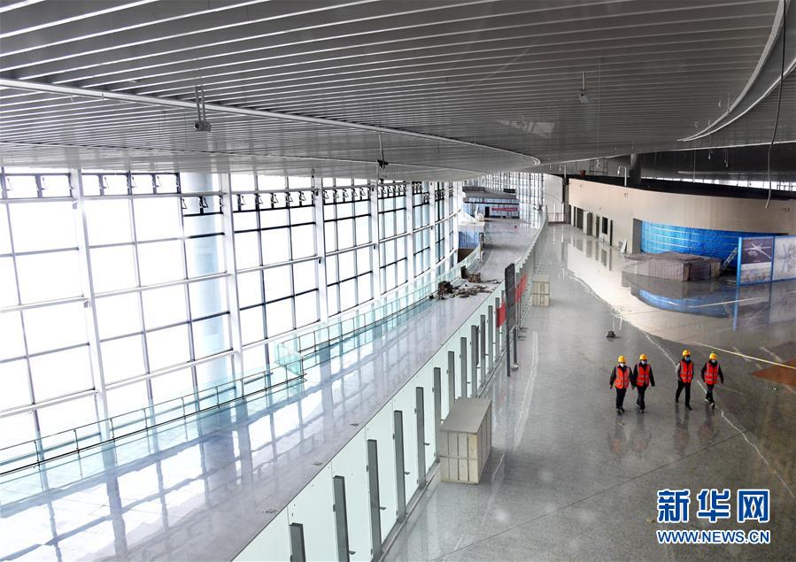 3月25日,几名工人从建设中的青岛胶东国际机场航站楼出发大厅走过。新华社记者李紫恒摄