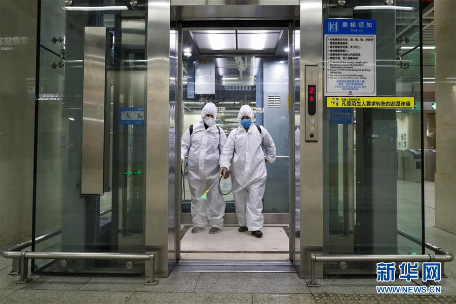 3月23日,在汉口火车站地铁站,保洁人员在为站厅电梯消毒。新华社记者沈伯韩摄