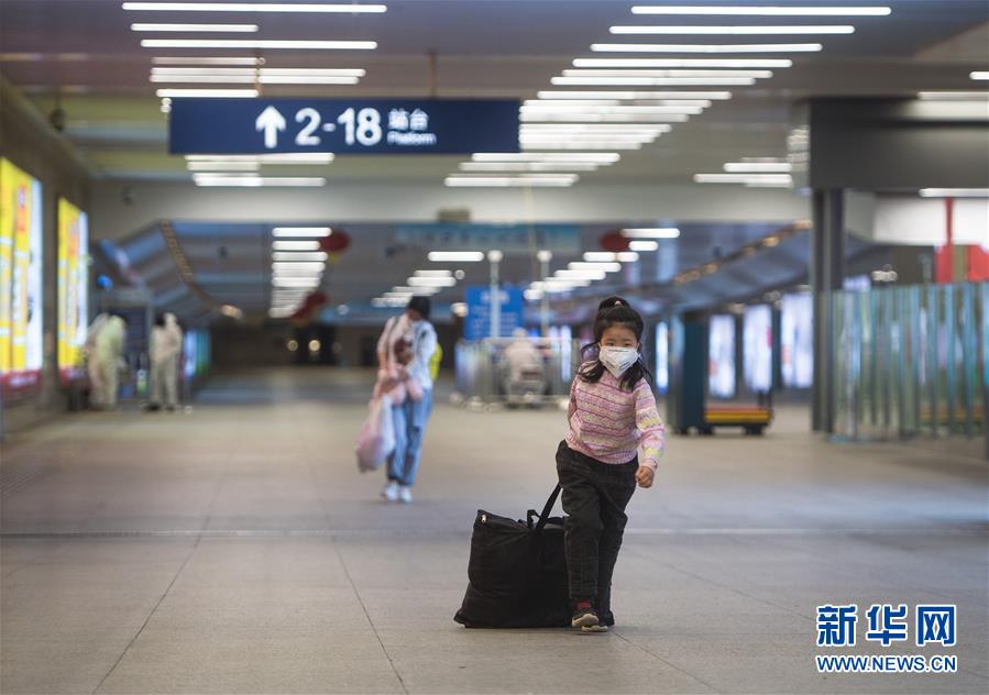 3月28日,在汉口火车站,一名小朋友帮家长提行李出站。当日零时起,武汉市恢复办理铁路客站到达业务。为做好抵汉旅客组织工作,武汉三大火车站安排专人提前与列车对接,核对下车人数,并组织工作人员和铁路志愿者提前在站台等候接车,做好组织引导。列车到达后,车站配合防疫部门做好旅客出站测温、登记信息等工作,并和公交集团、地铁公司联动,引导旅客按照去向有序换乘。新华社记者肖艺九摄