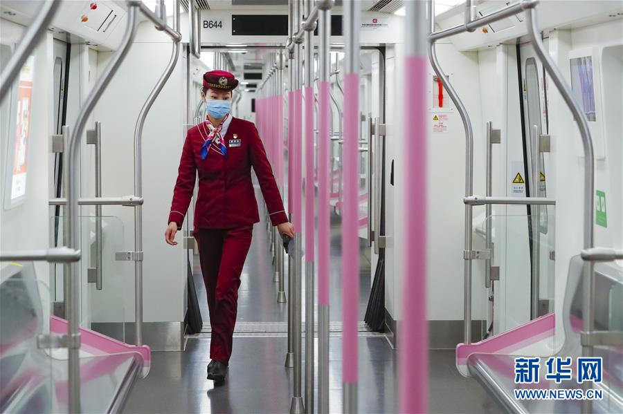 3月28日,武汉地铁运营有限公司司机吴亚在常青车辆段巡视车辆内部情况。新华社记者沈伯韩摄