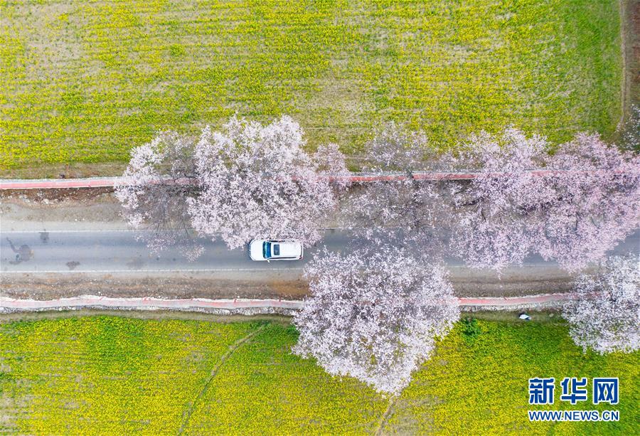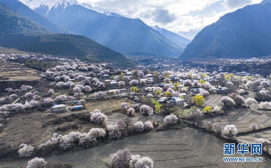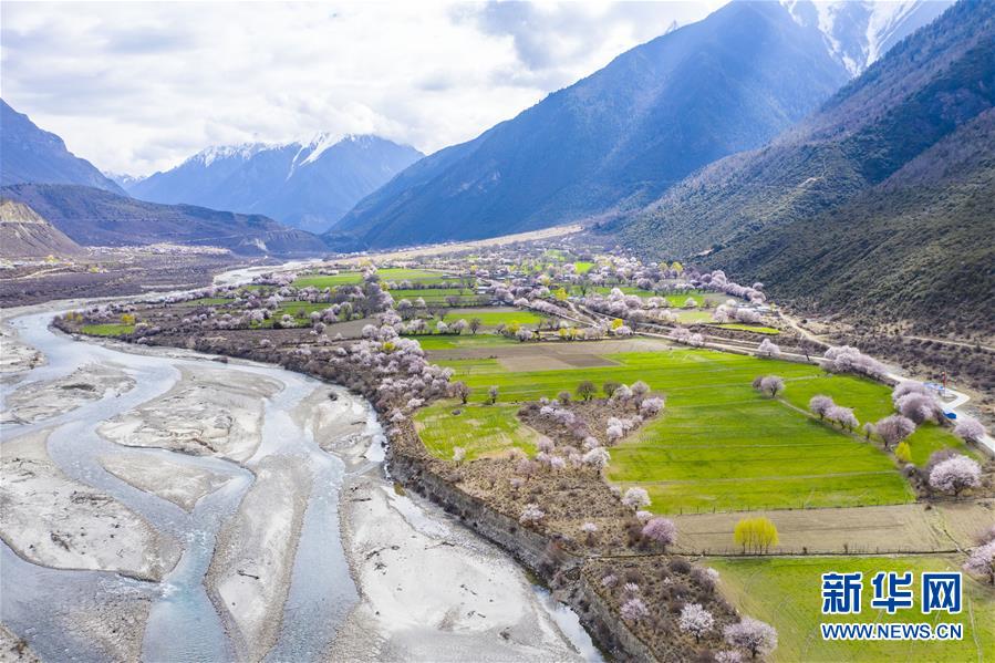 西藏林芝市波密县境内桃花盛开的田园风光(无人机照片,3月26日摄)。新华社记者 晋美多吉 摄