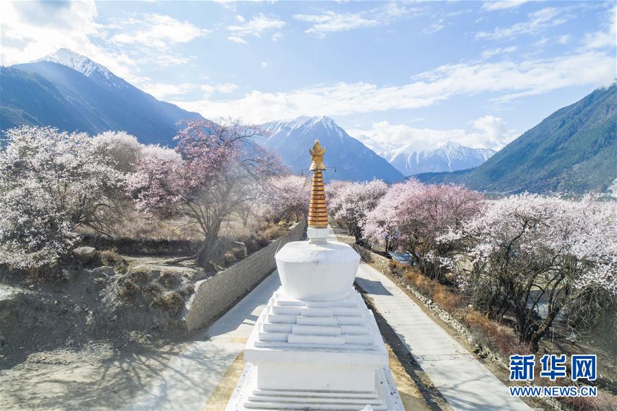 西藏林芝市波密县境内桃花盛开的田园风光(无人机照片,3月26日摄)。新华社记者 普布扎西 摄