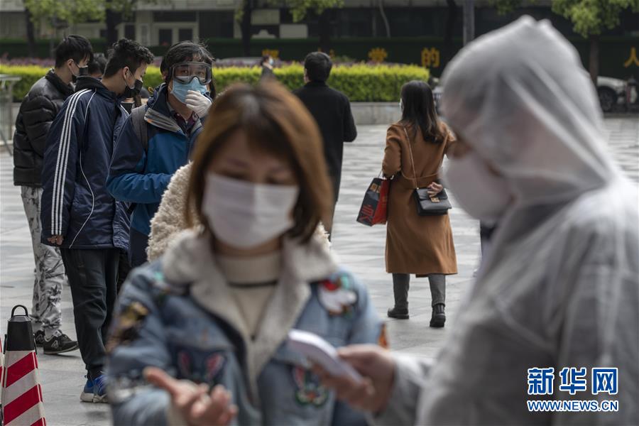 3月30日,在武商国际广场的超市门口,工作人员在测量顾客的体温。当日,武汉市多家商场开门迎客。新华社记者费茂华摄