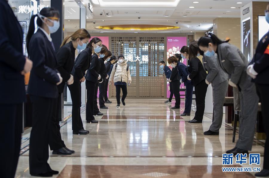 3月30日,在武商世贸广场,工作人员欢迎顾客进入。当日,武汉市多家商场开门迎客。新华社记者费茂华摄