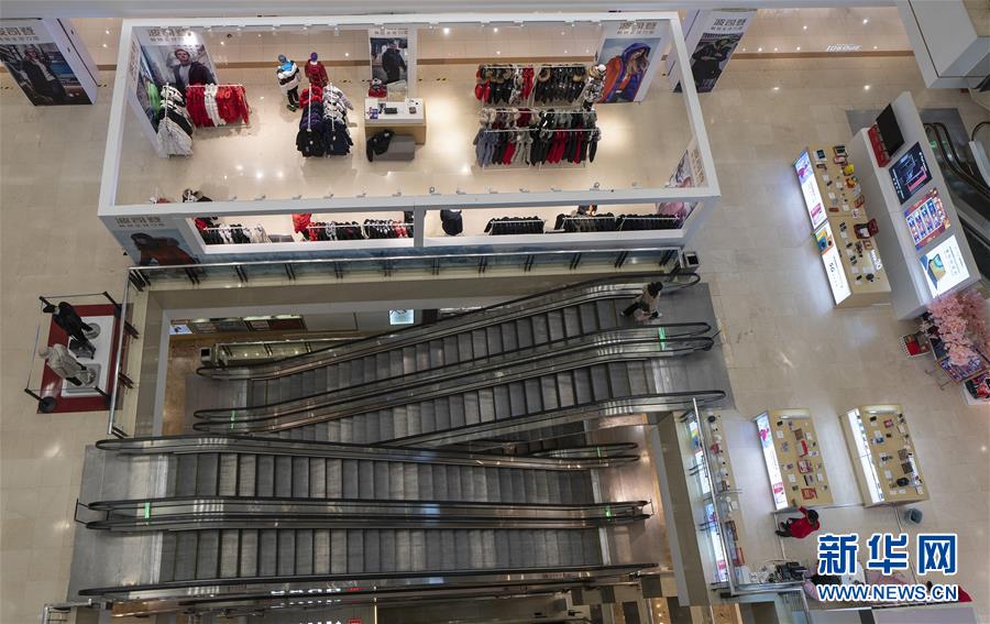 3月30日,在武商世贸广场,一位顾客乘坐滚梯。当日,武汉市多家商场开门迎客。新华社记者费茂华摄