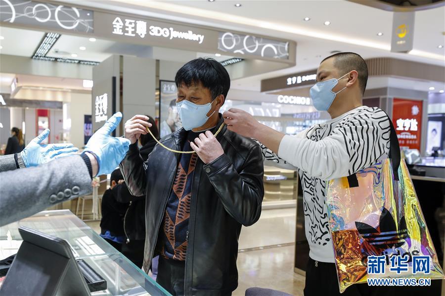 3月30日,在武汉市武商世贸广场,顾客(右二)在挑选饰品。当日,武汉市多家商场开门迎客。新华社记者沈伯韩摄