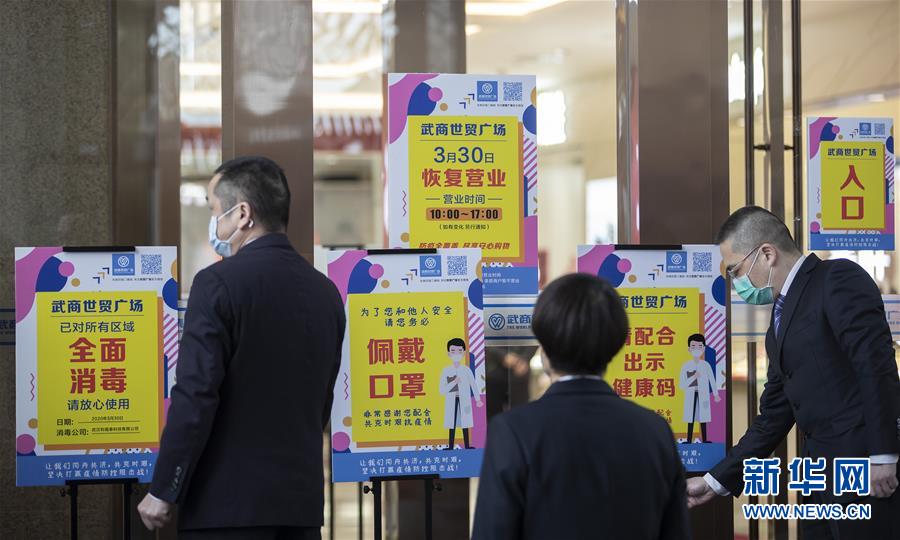 3月30日,在武商世贸广场,工作人员在开门前布置标志牌。当日,武汉市多家商场开门迎客。新华社记者费茂华摄