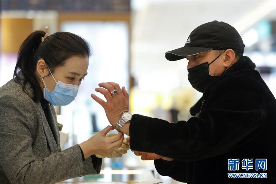 3月30日,在武汉市武商世贸广场,一名顾客(右)在挑选手表。当日,武汉市多家商场开门迎客。新华社记者沈伯韩摄
