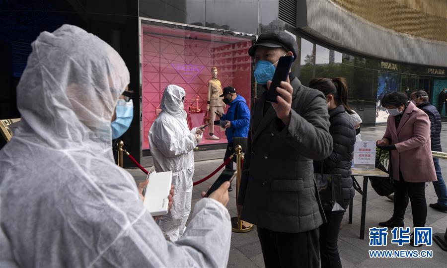 3月30日,在武商国际广场的超市门口,顾客向工作人员出示健康码。当日,武汉市多家商场开门迎客。新华社记者费茂华摄