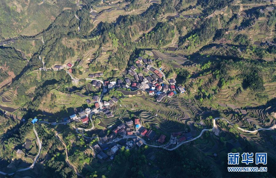 这是融水苗族自治县杆洞乡小河村高羽苗寨的木楼和梯田(3月31日摄,无人机照片)。随着气温逐渐转暖,广西融水苗族自治县杆洞乡的苗寨梯田景色迷人,美如画卷。新华社记者黄孝邦摄