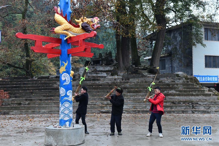 在乌英苗寨新芦笙柱下,融水苗族自治县苗族芦笙音乐代表性传承人梁安合(中)在练习吹芦笙(12月24日摄)。新华社记者王诺摄