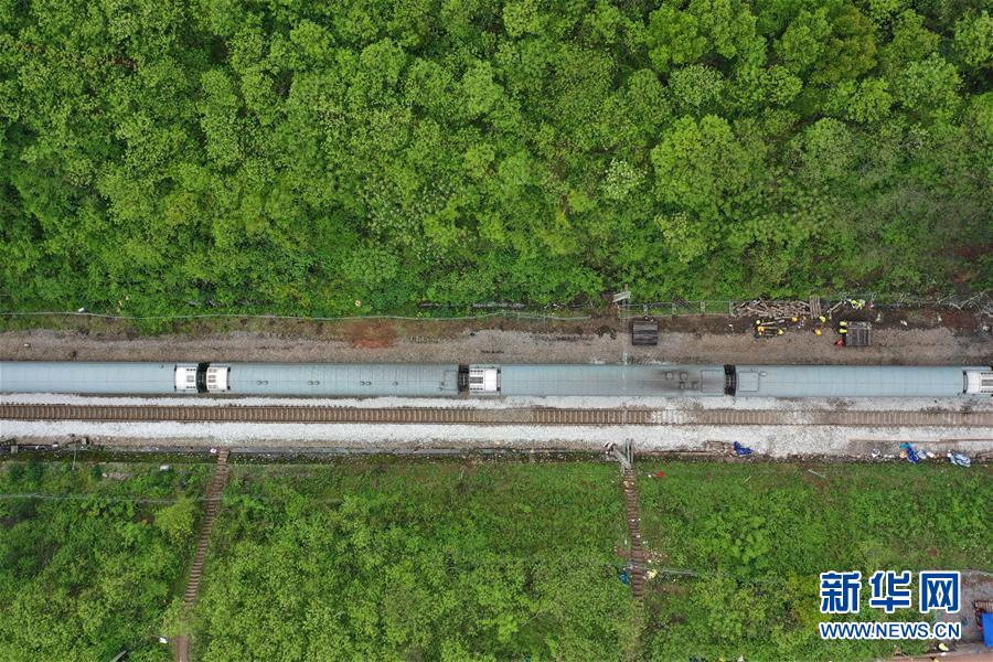 4月1日,Z201次旅客列车通过京广铁路郴州段脱轨事故区段(无人机照片)。新华社记者李尕摄