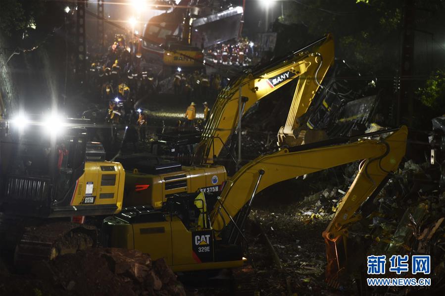 3月30日晚,工程机械在京广铁路郴州段脱轨事故现场作业。新华社记者李尕摄
