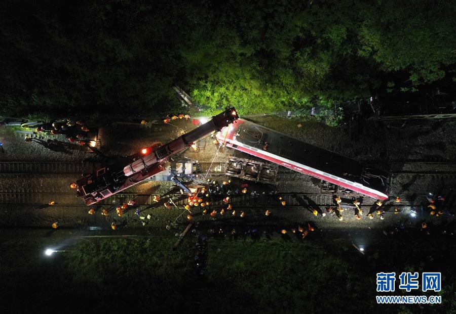 3月30日晚,工程机械在京广铁路郴州段脱轨事故现场作业(无人机照片)。新华社记者李尕摄