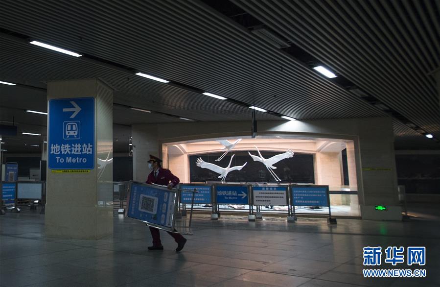 3月23日,在汉口火车站地铁站,工作人员将进站的二维码牌搬运至进站口。新华社记者肖艺九摄