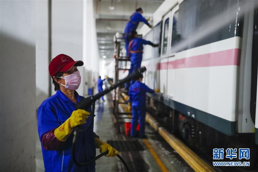 3月23日,在武汉地铁常青车辆段,保洁人员清洗地铁列车。新华社记者沈伯韩摄