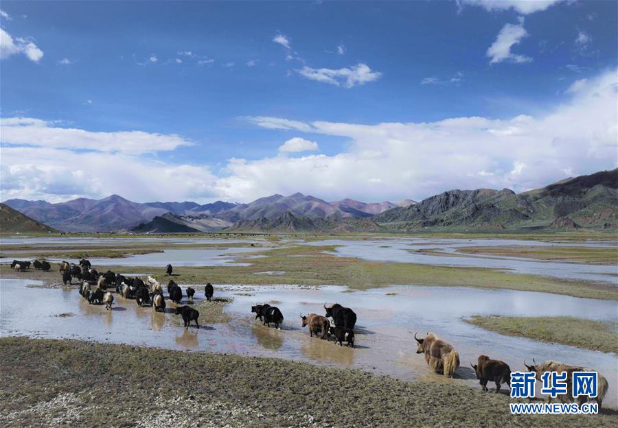 一群牦牛走过藏北湿地(2018年9月7日摄)。新华社记者普布扎西摄