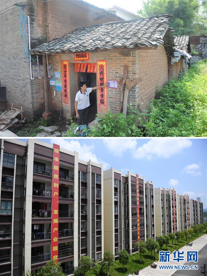拼版照片:上图为贫困户杨金生站在位于广西兴业县山心镇蓬塘村的老宅门口(2018年8月24日摄,兴业县委宣传部供图);下图为广西兴业县易地扶贫搬迁安置小区“老乡家园”内的居民楼,贫困户杨金生在这里有了自己的新房子(新华社记者曹祎铭2019年8月14日摄)。新华社发
