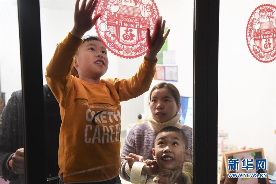 广西兴业县搬迁群众胡红君(后右)的儿子在新居内贴窗花(2020年1月20日摄)。新华社记者曹祎铭摄