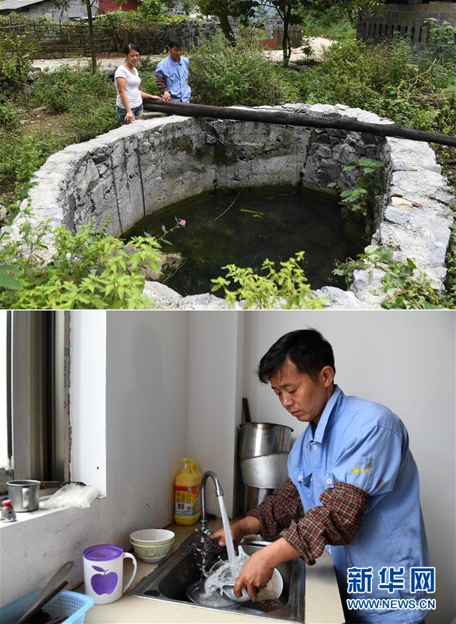 拼版照片:上图为在广西都安瑶族自治县下坳镇加八村龙力屯,袁朝强(右)和妻子罗兰香站在水井边(2017年10月12日摄);下图为在广西都安瑶族自治县下坳镇车家庄扶贫搬迁安置新区,袁朝强在自家新房里使用自来水洗碗(2017年10月12日摄)。新华社记者陆波岸摄