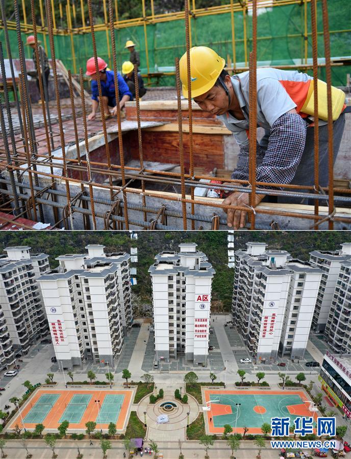 拼版照片:上图为工人在广西都安瑶族自治县八仙易地扶贫搬迁安置新区项目施工(2016年7月25日摄);下图为已经建成入住的广西都安瑶族自治县八仙易地扶贫搬迁安置新区部分楼房(无人机照片,2019年10月16日摄)。新华社记者陆波岸摄