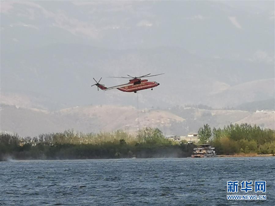 3月31日,在四川省西昌市,救火直升机从邛海取水。新华社记者惠小勇摄