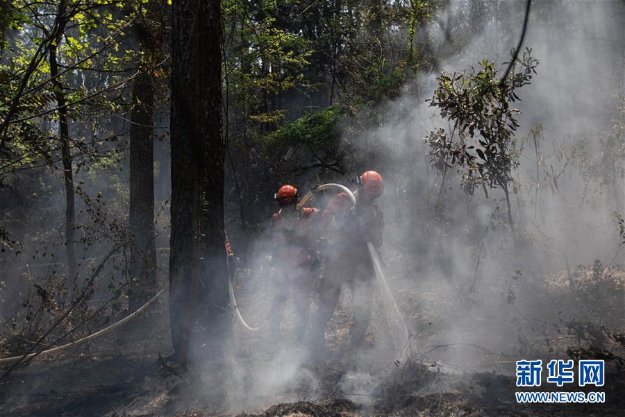 4月1日,四川省森林消防总队队员用水扑灭余火和烟点。新华社记者江宏景摄