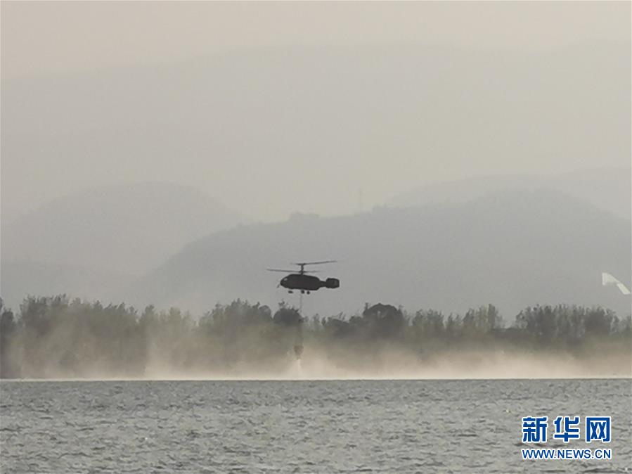 4月1日,一架参与西昌森林火灾灭火的直升机在邛海中取水(手机拍摄)。新华社记者惠小勇摄