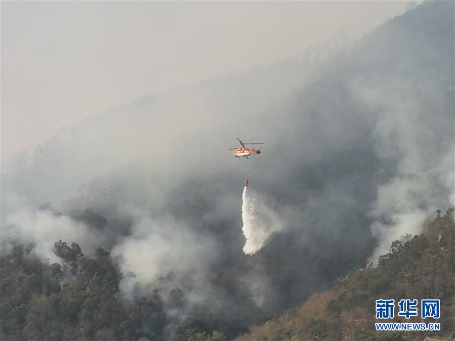 4月1日,救火直升机在西昌森林火灾现场灭火(手机拍摄)。新华社记者惠小勇摄