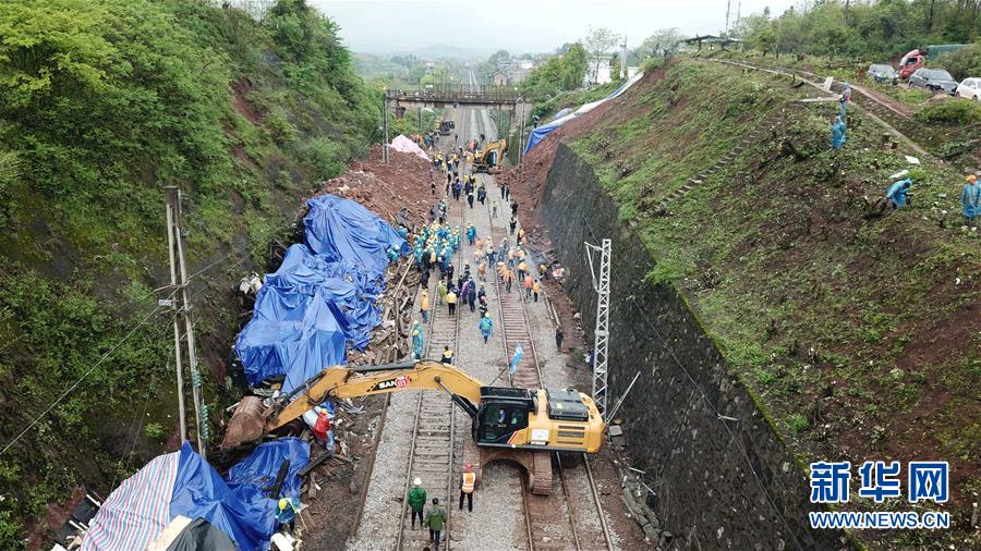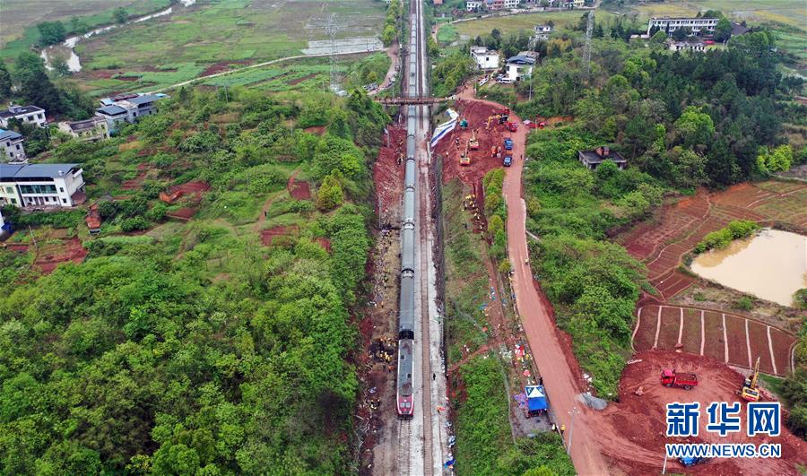 4月1日,Z201次旅客列车通过京广铁路郴州段脱轨事故区段(无人机照片)。新华社记者李尕摄