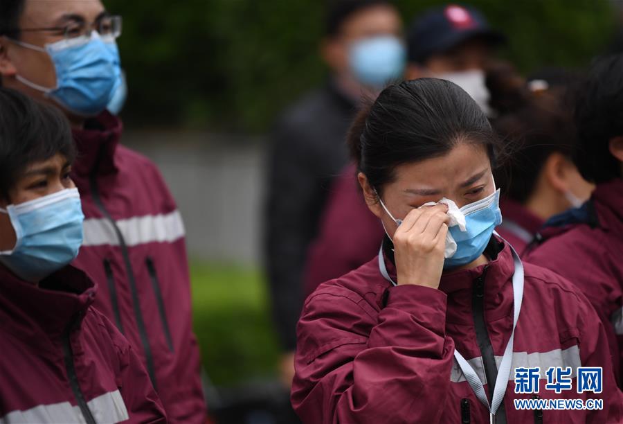 4月3日,来自陕西省榆林市第一医院的医疗队队员王晶晶(中)在送别“战友”后落泪。 当日,陕西省第一批援鄂医疗队137名队员在陕西省工人疗养院结束了为期两周的隔离休养。医疗队员与“战友”深情作别后,陆续踏上归途。 新华社记者 李一博 摄