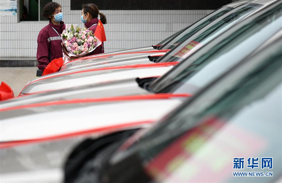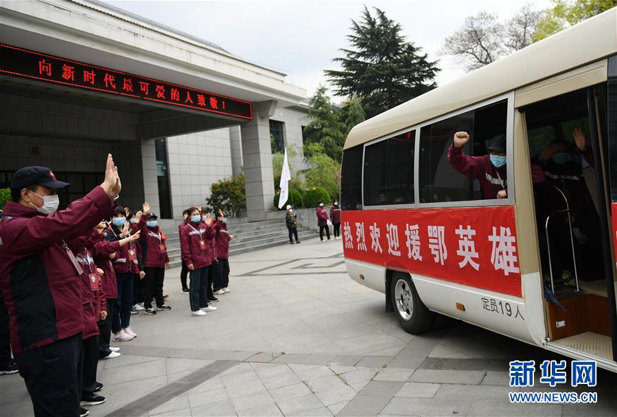 4月3日,乘车踏上归途的宝鸡市三家医院的医疗队队员与“战友”告别。 当日,陕西省第一批援鄂医疗队137名队员在陕西省工人疗养院结束了为期两周的隔离休养。医疗队员与“战友”深情作别后,陆续踏上归途。 新华社记者 李一博 摄