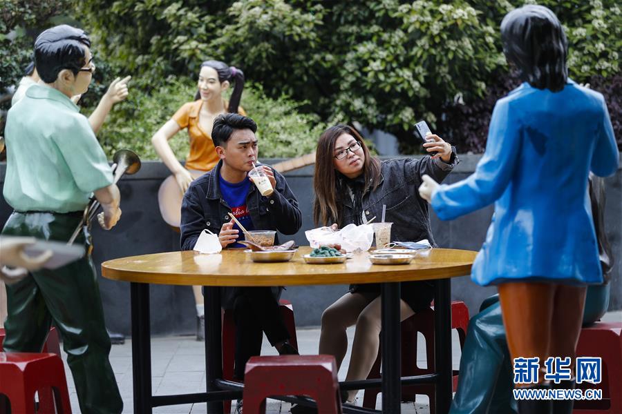 4月5日,人们在武汉市吉庆街的“大排档”雕塑旁吃热干面。新华社记者沈伯韩摄
