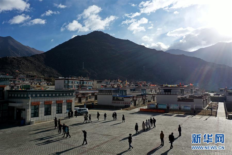居民走在拉萨市堆龙德庆区古荣乡荣玛高海拔生态搬迁点广场上(4月2日摄,无人机照片)。新华社记者 詹彦 摄