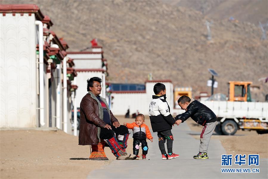 在拉萨市堆龙德庆区古荣乡荣玛高海拔生态搬迁点,美琼(左一)和孩子们在家门口玩耍(4月1日摄)。美琼一家在搬迁点分到一套120平米的房子。美琼还和朋友合伙在搬迁点的扶贫综合门面房租了一间店面,开了一家销售日用品的小商店。新华社记者 詹彦 摄