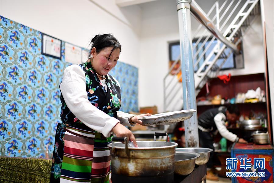 在拉萨市堆龙德庆区古荣乡荣玛高海拔生态搬迁点,欧措(左)和儿子索朗普布在自家开的藏餐馆里忙碌(4月1日摄)。新华社记者 詹彦 摄
