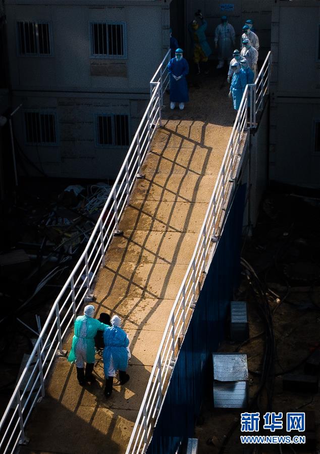 2月4日,医护人员将患者送入武汉火神山医院病房(无人机照片)。 新华社记者肖艺九摄
