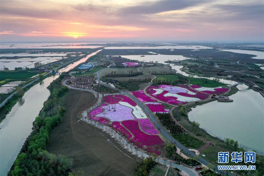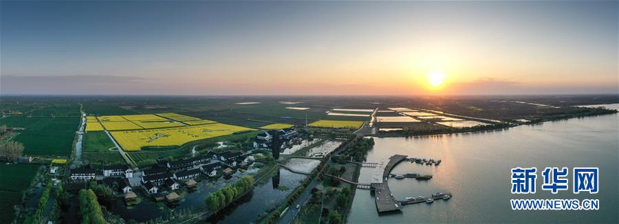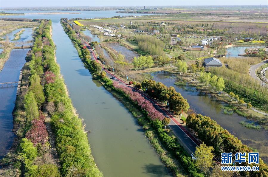 这是4月6日拍摄的白马湖风光(无人机全景照片)。近日,江苏省淮安市白马湖畔春花绽放,景色怡人。白马湖地处淮河流域下游,东贯大运河,西倚洪泽湖,南北分别衔接淮河入江水道和入海水道,湖泊水域面积113平方公里,是全国15个生态良好重点保护湖泊之一。 新华社记者 杨磊 摄