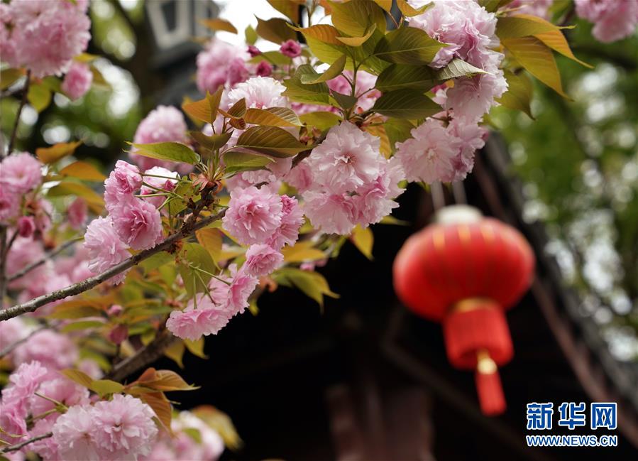 在位于上海松江的江南古典园林——醉白池,晚樱盛放(4月6日摄)。 新华社记者 刘颖 摄