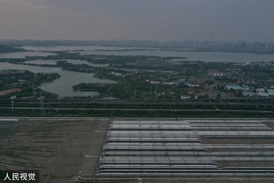 2020年4月6日,武汉动车段高铁动车组整装待发(无人机照片)。