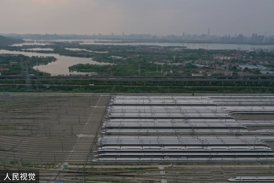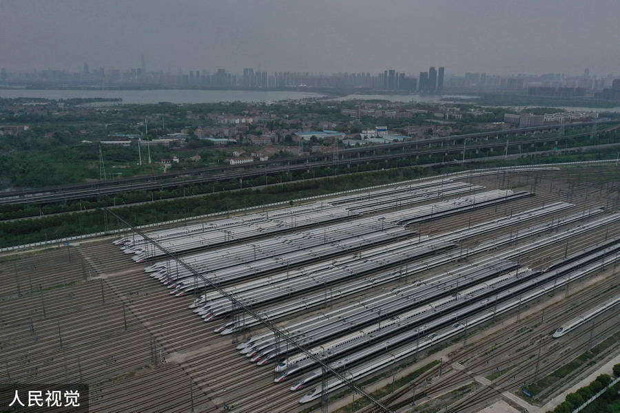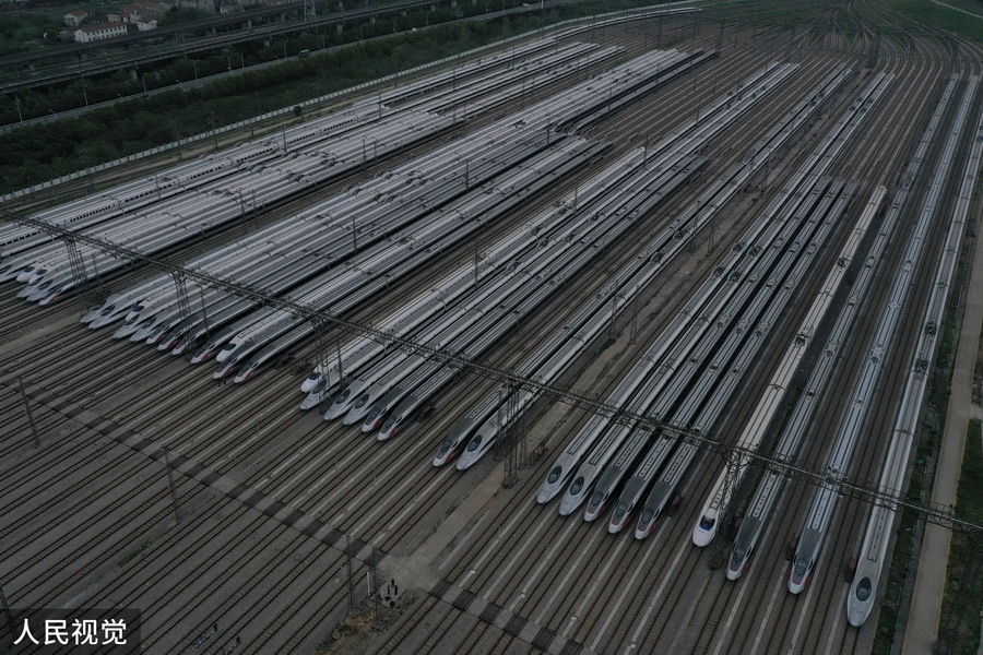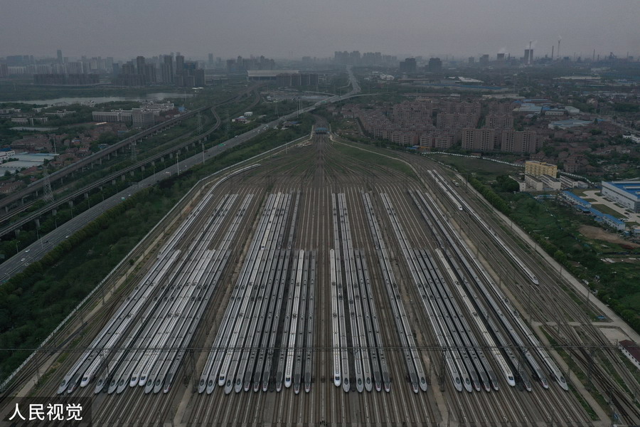 2020年4月6日,武汉动车段高铁动车组整装待发(无人机照片)。