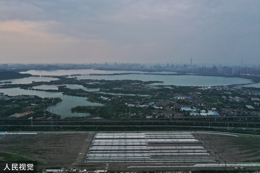 2020年4月6日,武汉动车段高铁动车组整装待发(无人机照片)。