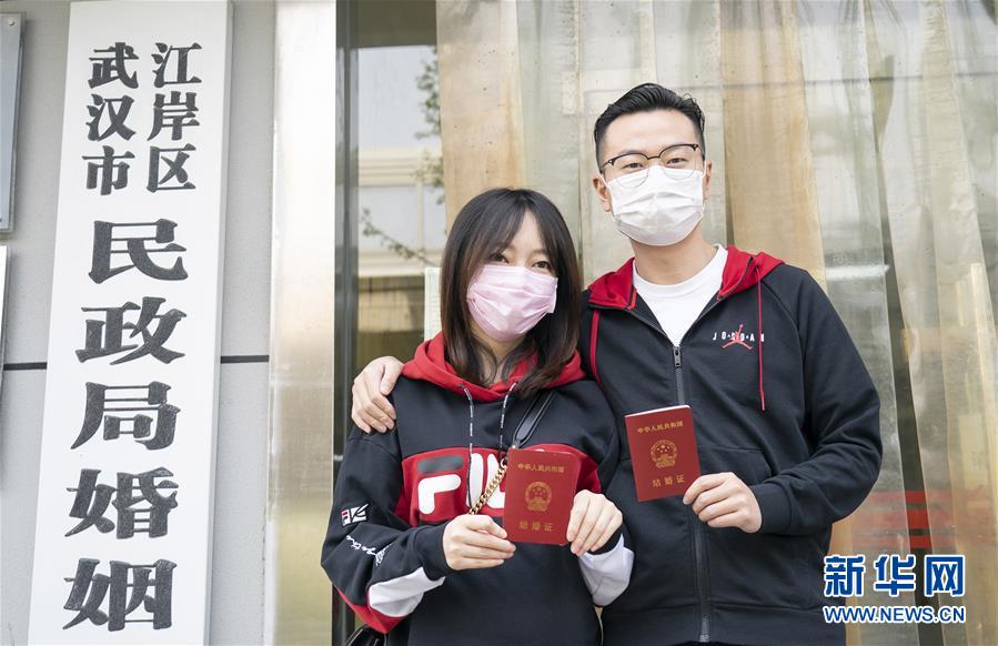 4月7日,在武汉市江岸区民政局婚姻登记处,陈先生与张女士展示结婚证。4月3日起,武汉市婚姻登记机构陆续恢复办理婚姻登记业务。婚姻当事人需持绿色健康码预约登记,分批分时办理。 新华社记者才扬摄