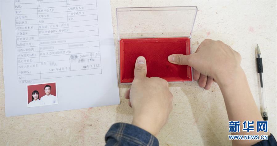 4月7日,在武汉市江岸区民政局婚姻登记处,新人办理结婚手续时按手印。 新华社记者才扬摄
