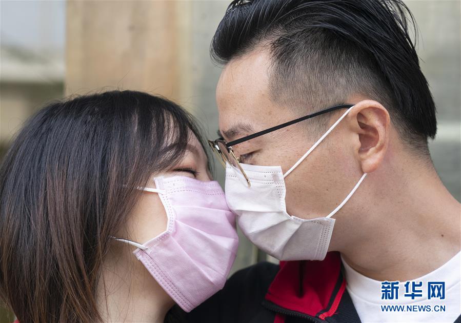 4月7日,在武汉市江岸区民政局婚姻登记处,陈先生与张女士隔着口罩亲吻。 新华社记者才扬摄