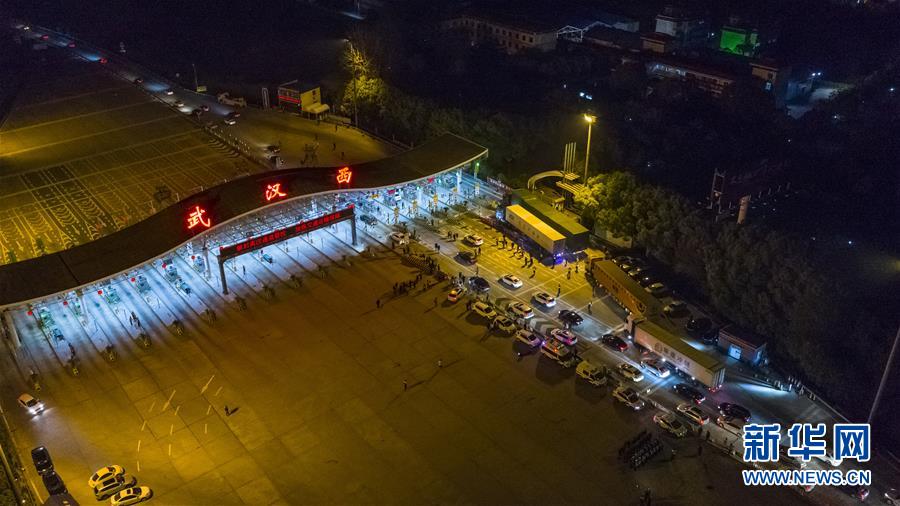 4月8日凌晨,车辆通过武汉西高速收费站(无人机拍摄)。 新华社记者 沈伯韩 摄